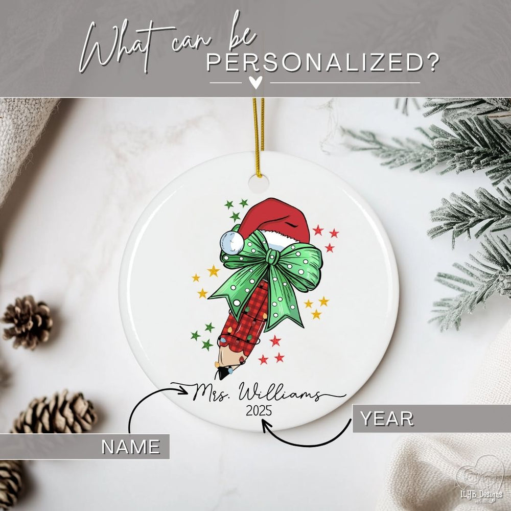 Personalized Teacher Ornament with Coquette Bow and Pencil | Teacher Keepsake Ornament