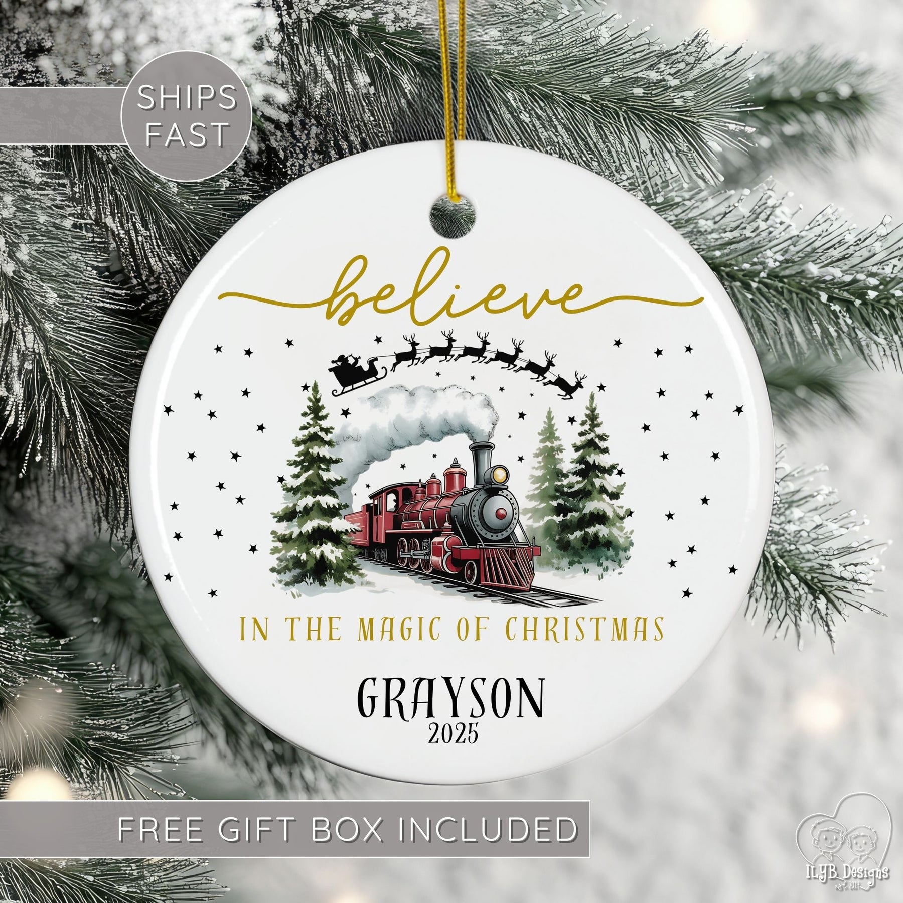 The elegant gold script reads āBelieve in the Magic of Christmas,ā with your custom name and year below. A timeless holiday keepsake ornament, perfect for family traditions, childrenās Christmas gifts, or anyone who loves the magic of trains at Christmas.