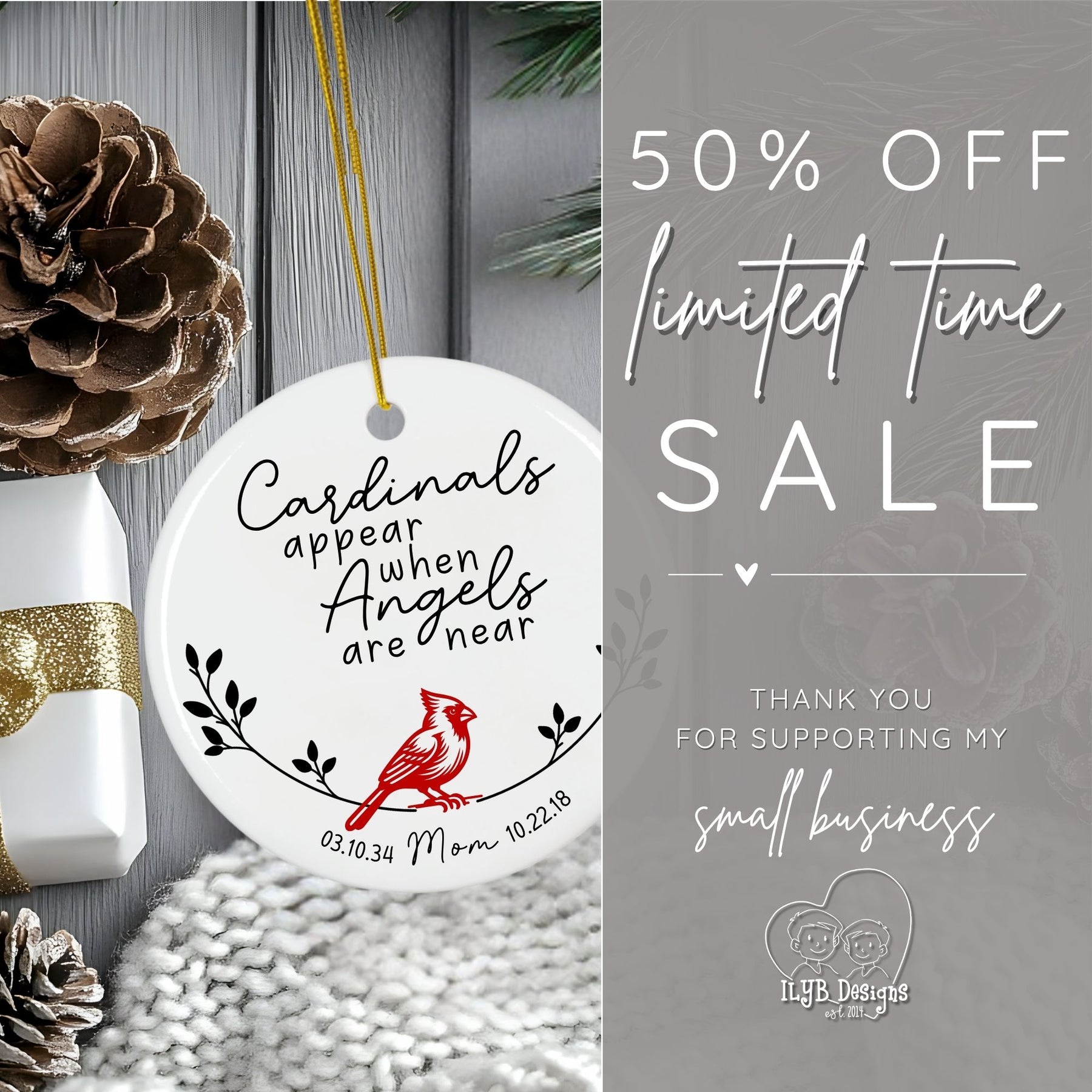 Beautifully designed with a red cardinal, delicate branches, and your loved one’s name and birth/death dates, this ceramic ornament is a meaningful Christmas remembrance keepsake.
