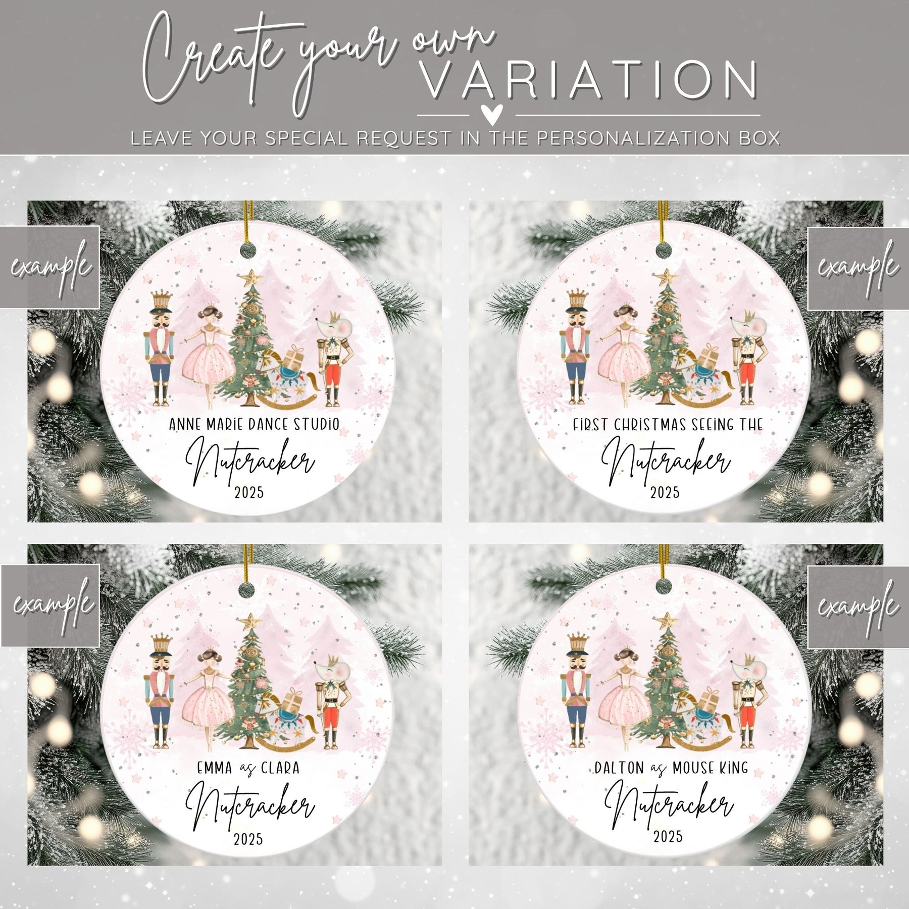Graphic showing 4 different possible personalized variations of the ceramic Nutcracker ballet ornament. You can customize the top line of text to say anything you want such as: "Your Dance Studio Name", "Emma as Clara", "First Christmas seeing the Nutcracker", or "Dalton as Mouse King" followed by "Nutcracker" written in elegant script font and the year underneath.