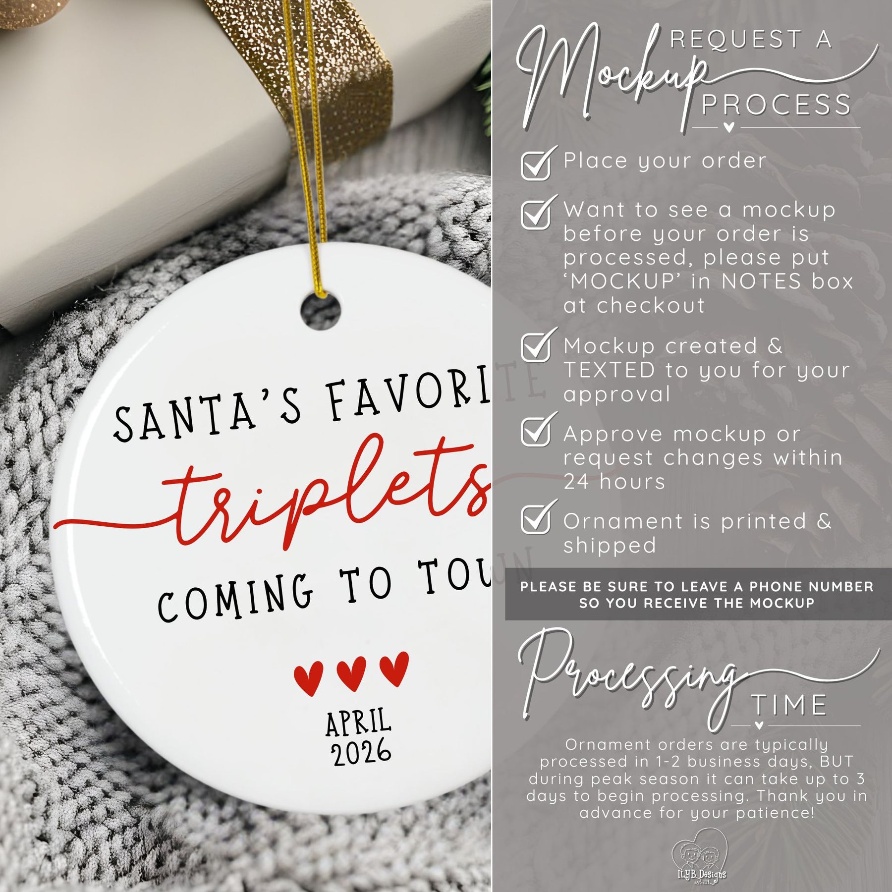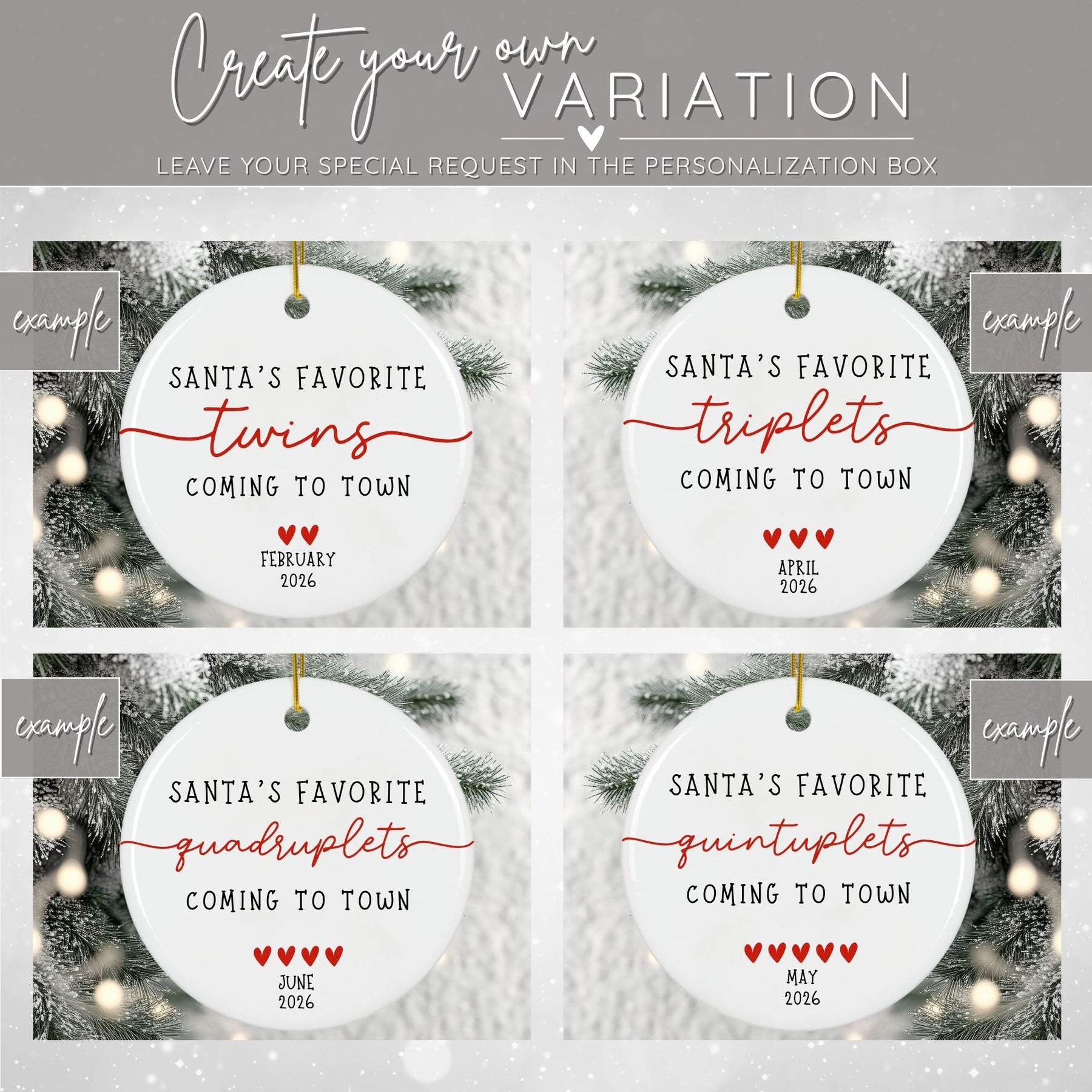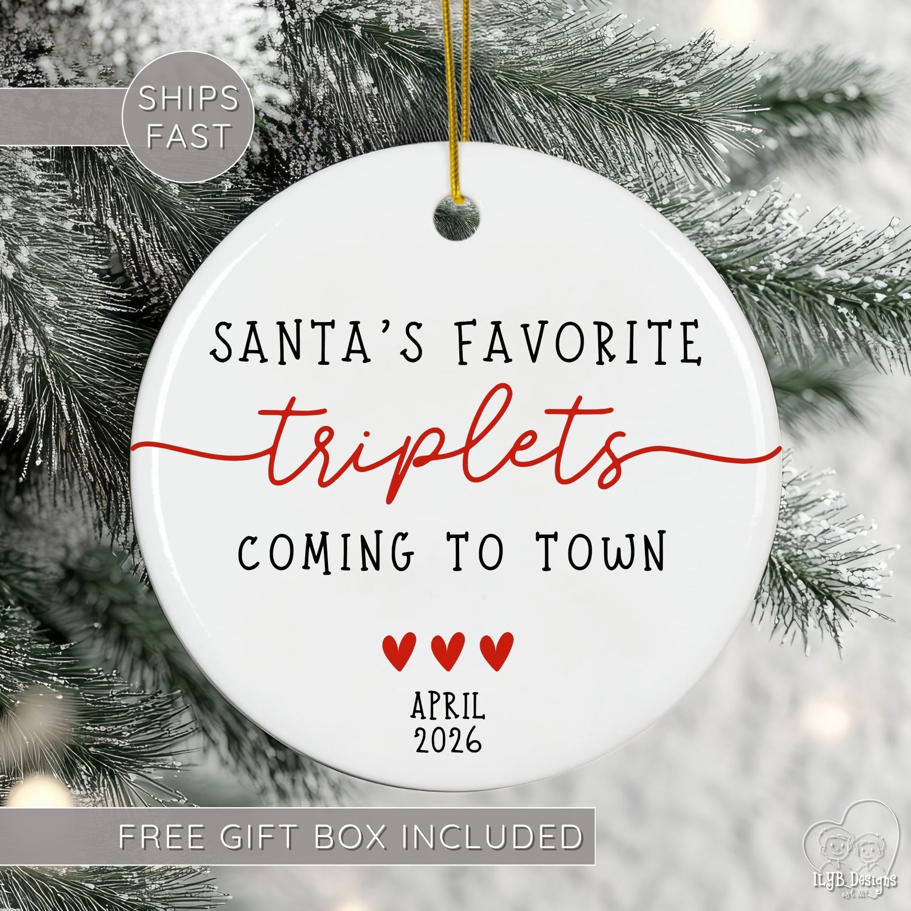Celebrate exciting news of a multiples pregnancy with this personalized ceramic triplets Christmas ornament featuring the phrase āSantaās Favorite [Triplets] Coming to Townā with your custom month and year due date.