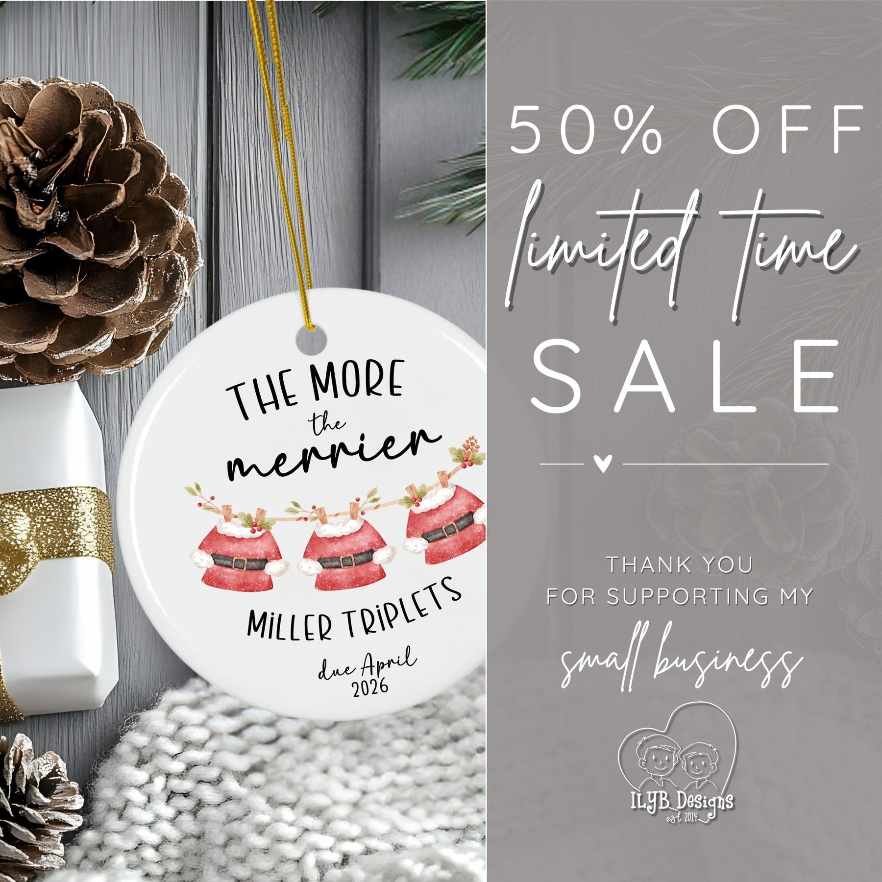 Celebrate the joy of a multiples pregnancy with this personalized ceramic Christmas ornament featuring the festive phrase āThe More the Merrierā, your custom name, number of babies (twins, triplets, quadruplets, or more), and month/year due date.