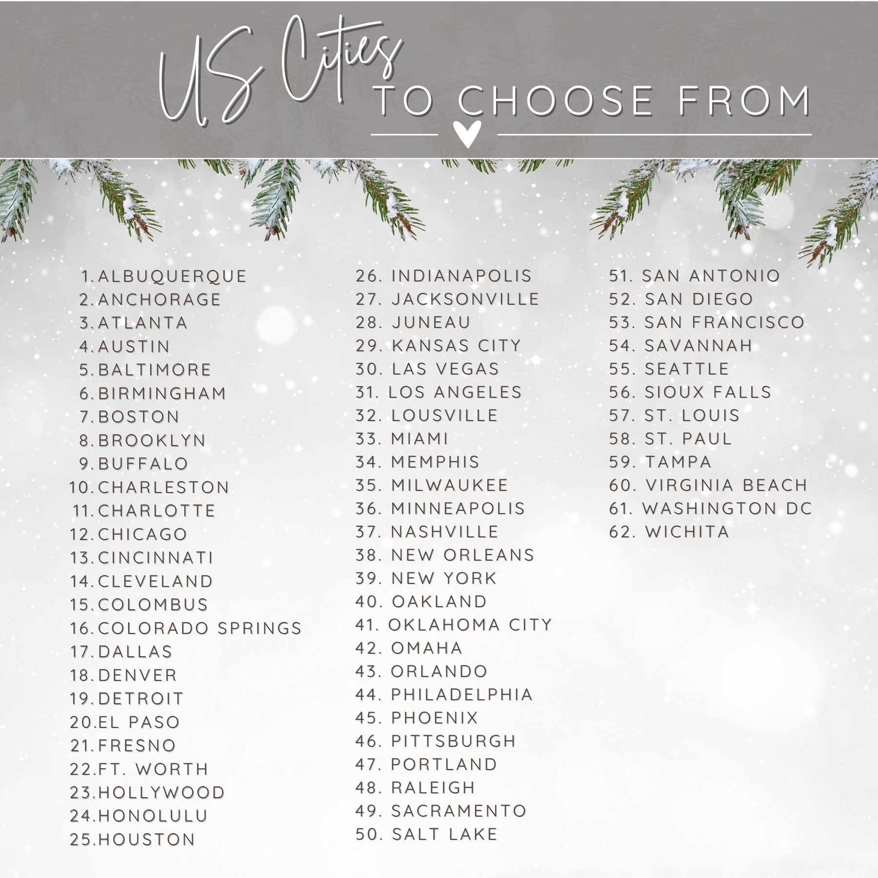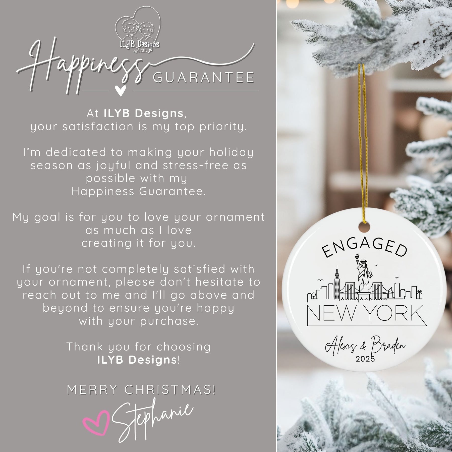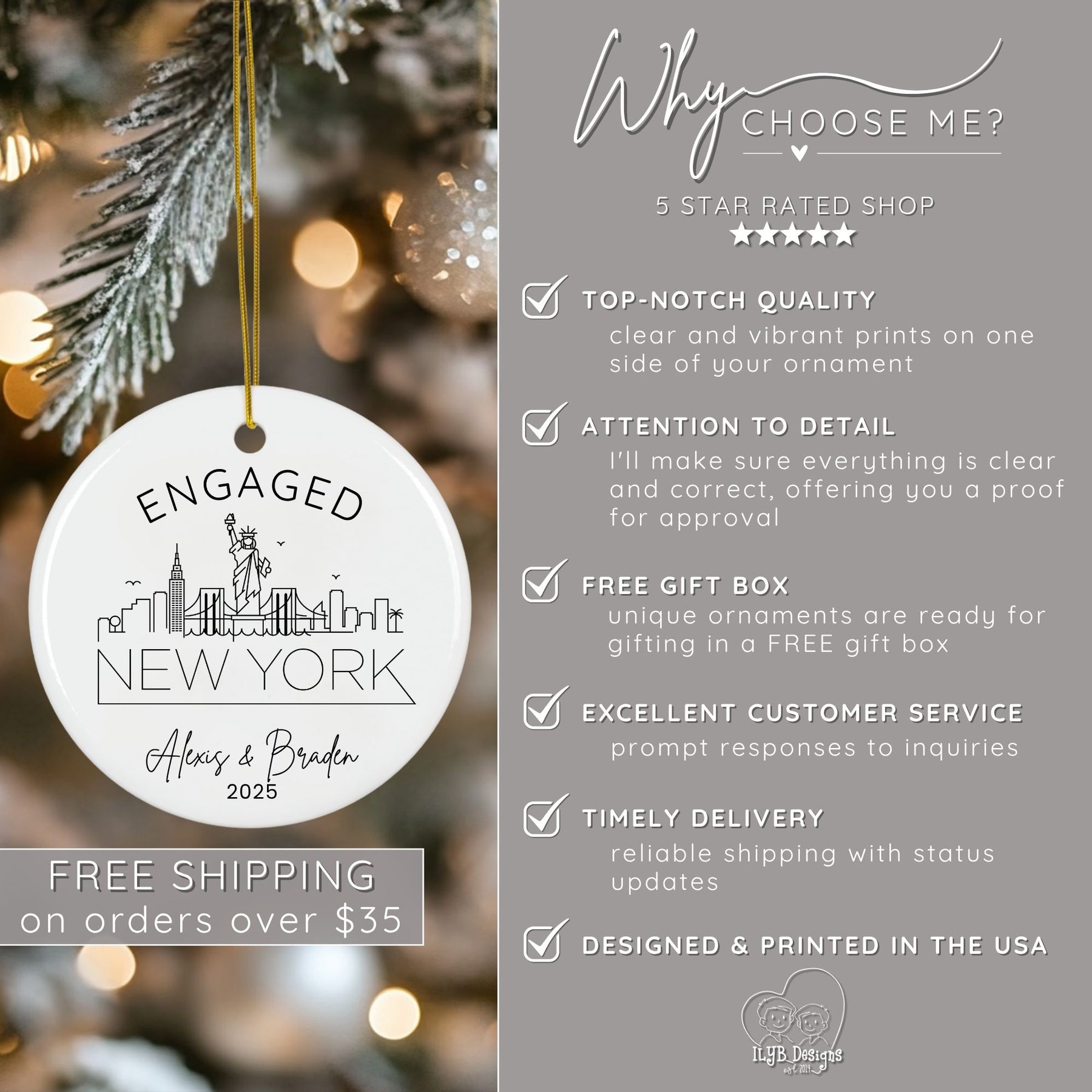 Celebrate a special moment with this charming engagement ornament, featuring a personalized US city skyline for the newly engaged couple. Skylines for over 60 US cities to choose from.