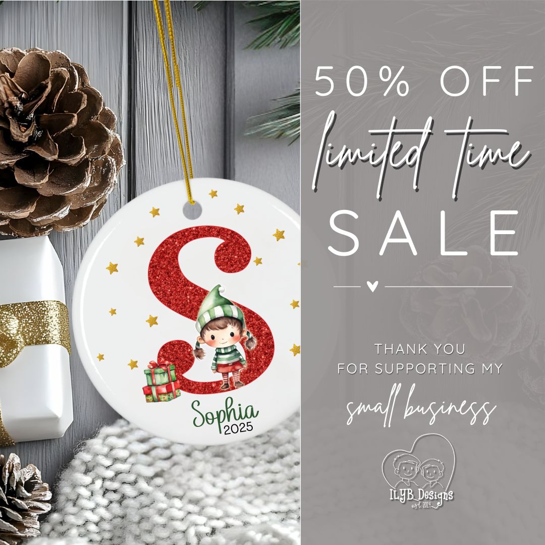 Customize with your choice of name, year, initial, and select a girl or boy elf design.